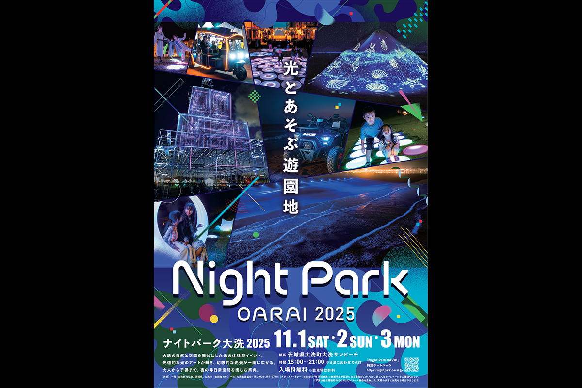 茨城県大洗町にて、幻想的な体験型ナイトイベント『Night Park OARAI 2025』が、2025年11月1日(土)から3日(月・祝)の3日間にわたり開催されます。会場となる大洗サンビーチは、日中の姿から一転、夜になると幻想的な光に包まれる非日常空間へと変貌します。光のアートに彩られた夜の砂浜は、まるで巨大な「光の遊園地」のよう。最先端のテクノロジーを活用したインスタレーションが砂浜一帯に展開され、訪れる人々を夢のような世界へと誘います。