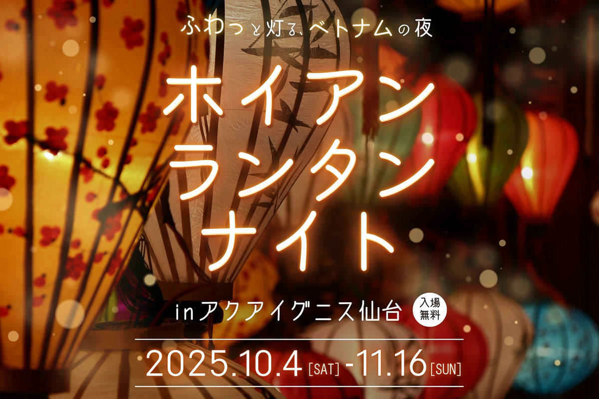 アクアイグニス仙台(仙台市若林区)にて、2025年10月4日(土)から11月16日(日)までの期間限定で「ホイアンランタンナイト」が初開催されます。会場では、ベトナム中部の古都ホイアンから届いた約200個のランタンが色鮮やかにライトアップされ、秋の夜長を幻想的に彩ります。