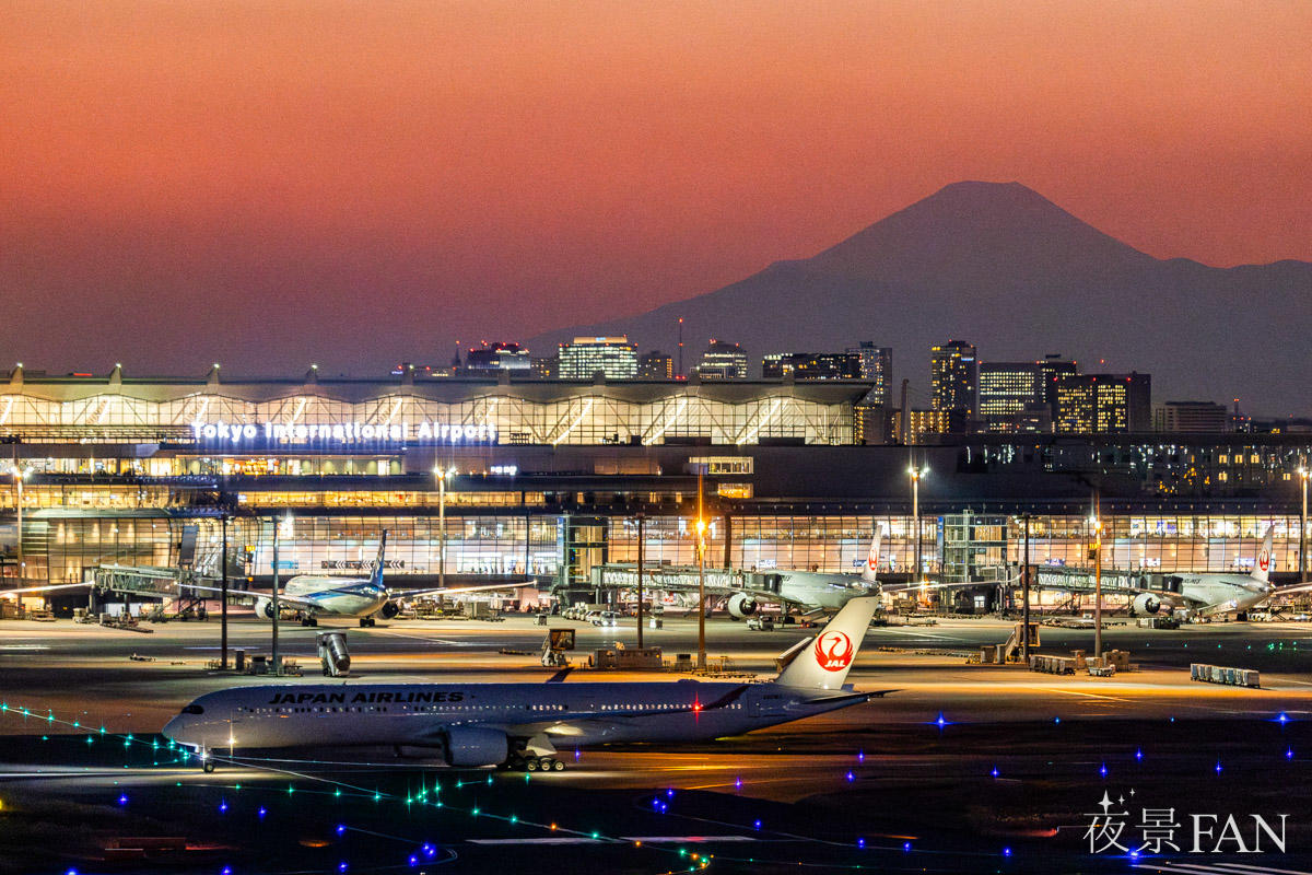 くっきりと浮かぶ富士山、ターミナル、飛行機。この三つが同時に成立するのは、空気が澄む冬だからこその光景です。慌ただしい空港でありながら、マジックアワーのわずかな時間にだけ訪れる静かな時間。その一瞬を切り取った、冬の羽田空港の夜景でした。
