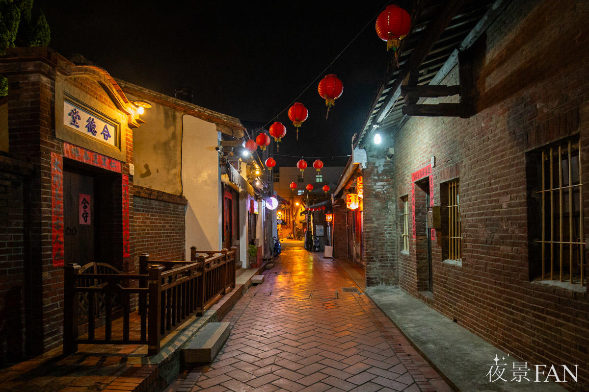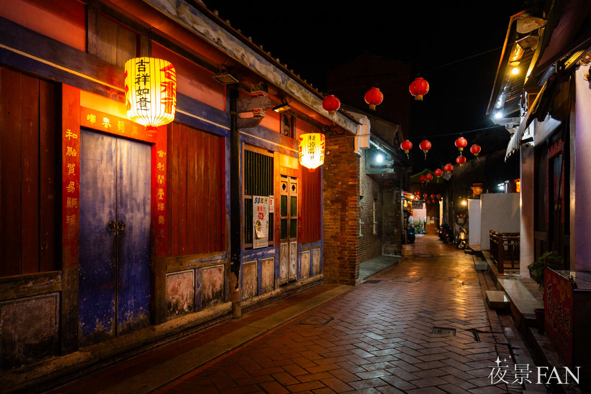 夜の鹿港老街では、人影の少ない路地にノスタルジックな雰囲気が広がります。曲がりくねった赤煉瓦の路地の両側には、修復された古い家屋が並び、提灯や軒先の灯りが街路を柔らかく照らします。昼の賑わいが消え、建物の質感や路地の奥行きが際立つ時間帯です。