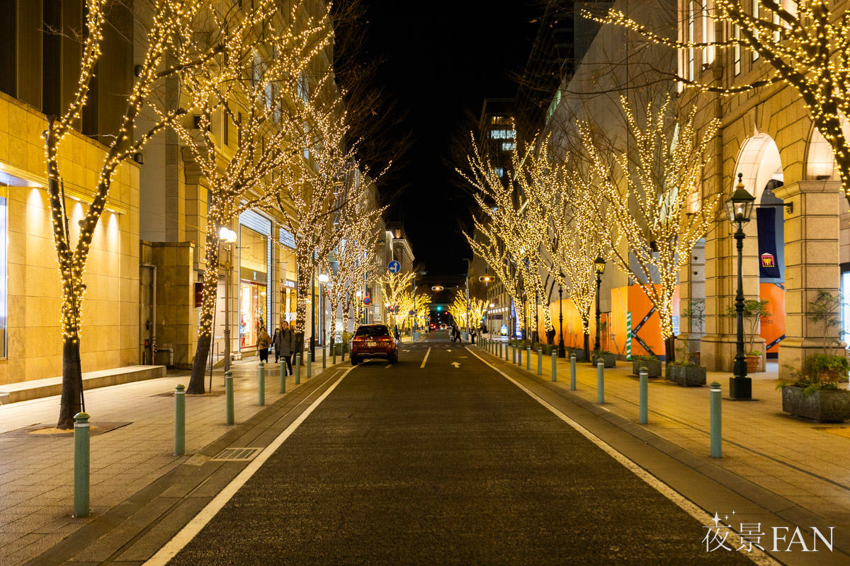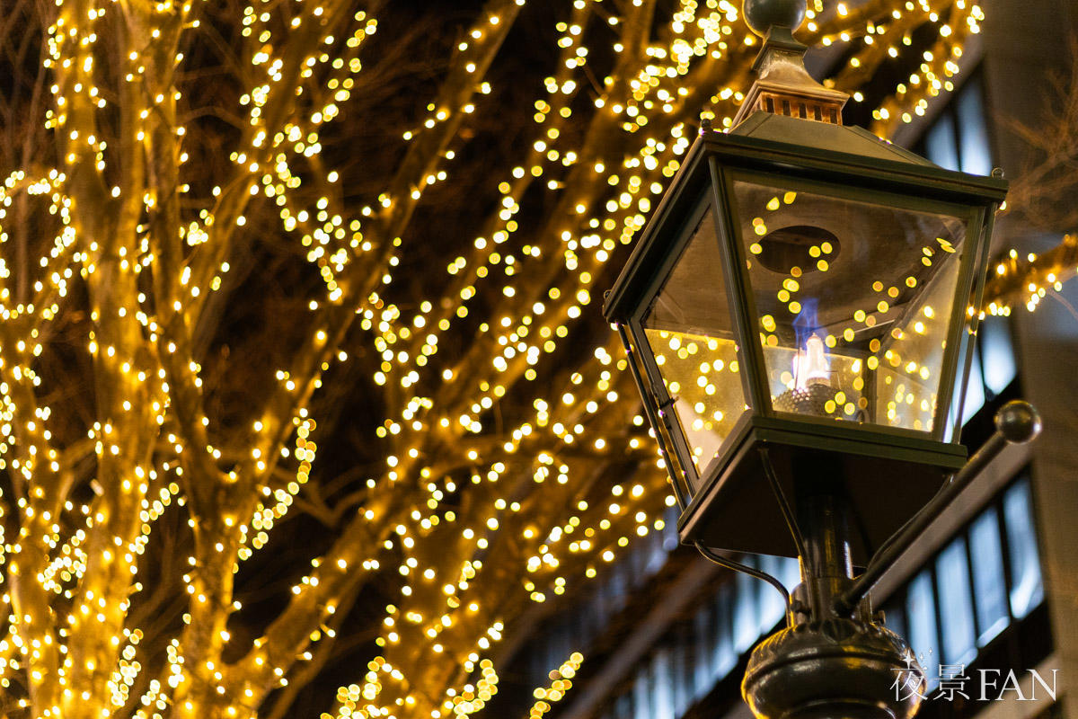 神戸・旧居留地の中心を南北に伸びる明石町筋は、歴史と洗練が静かに調和する街路です。石造りの重厚な建築とアーチが連なる景観は、港町神戸の記憶を今に伝えています。夜になると並木が温かなイルミネーションに包まれ、通りは黄金色の光に染まります。さらに、この通りを象徴するのがやわらかな炎を灯すガス灯。揺らぐ光が石壁や舗道を優しく照らし、どこか異国情緒を感じさせる空気を生み出します。直線的に伸びる道路とシャンパンゴールドの光の連なりが奥行きを演出し、歩くだけで映画のワンシーンのような夜景に出会える場所。派手さではなく、質感と品格で魅せる大人の夜景スポットです。