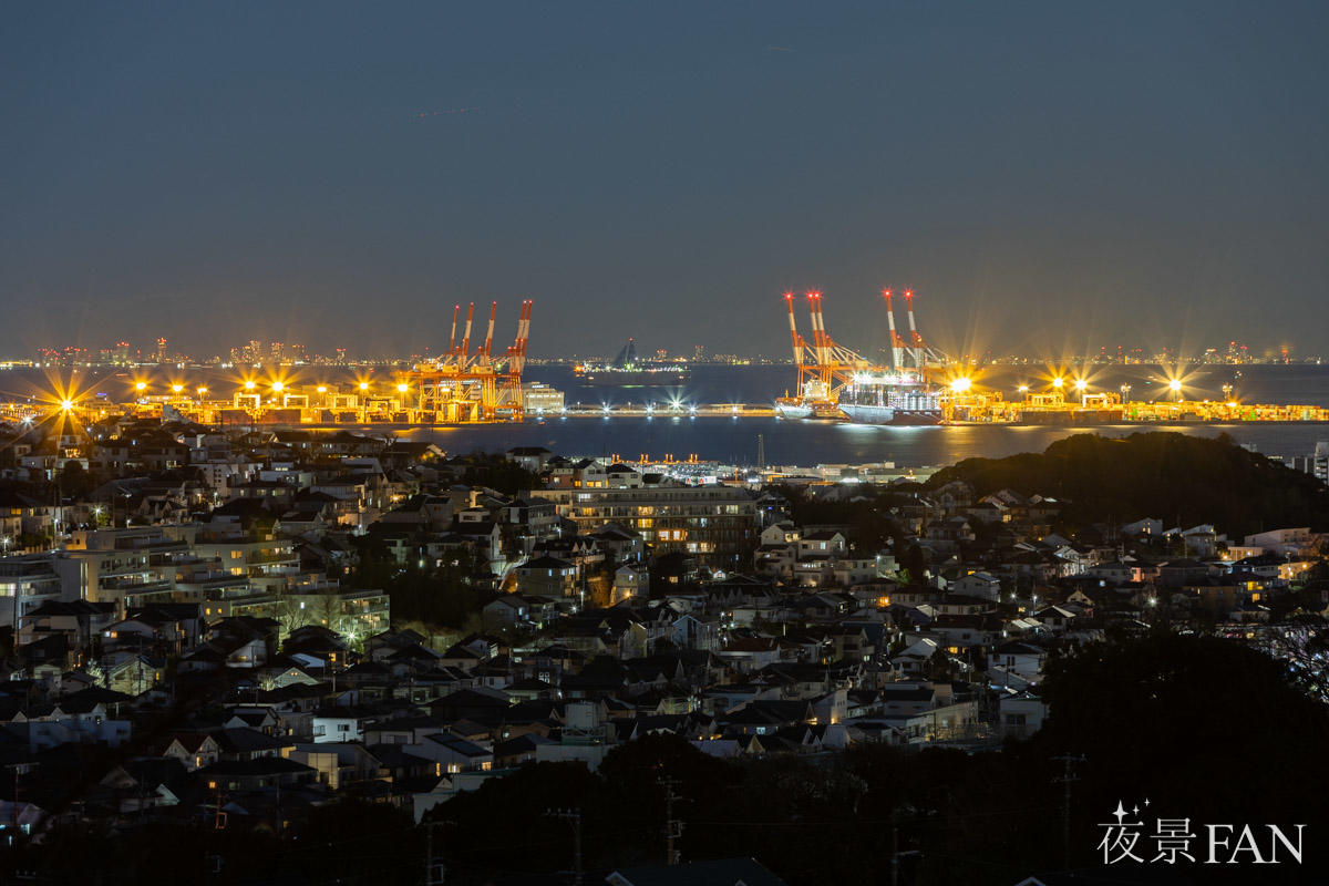 眼下には金沢区・磯子区の住宅地夜景が広がり、その先にはオレンジ色に輝く南本牧ふ頭のコンテナターミナルが印象的に浮かび上がります。