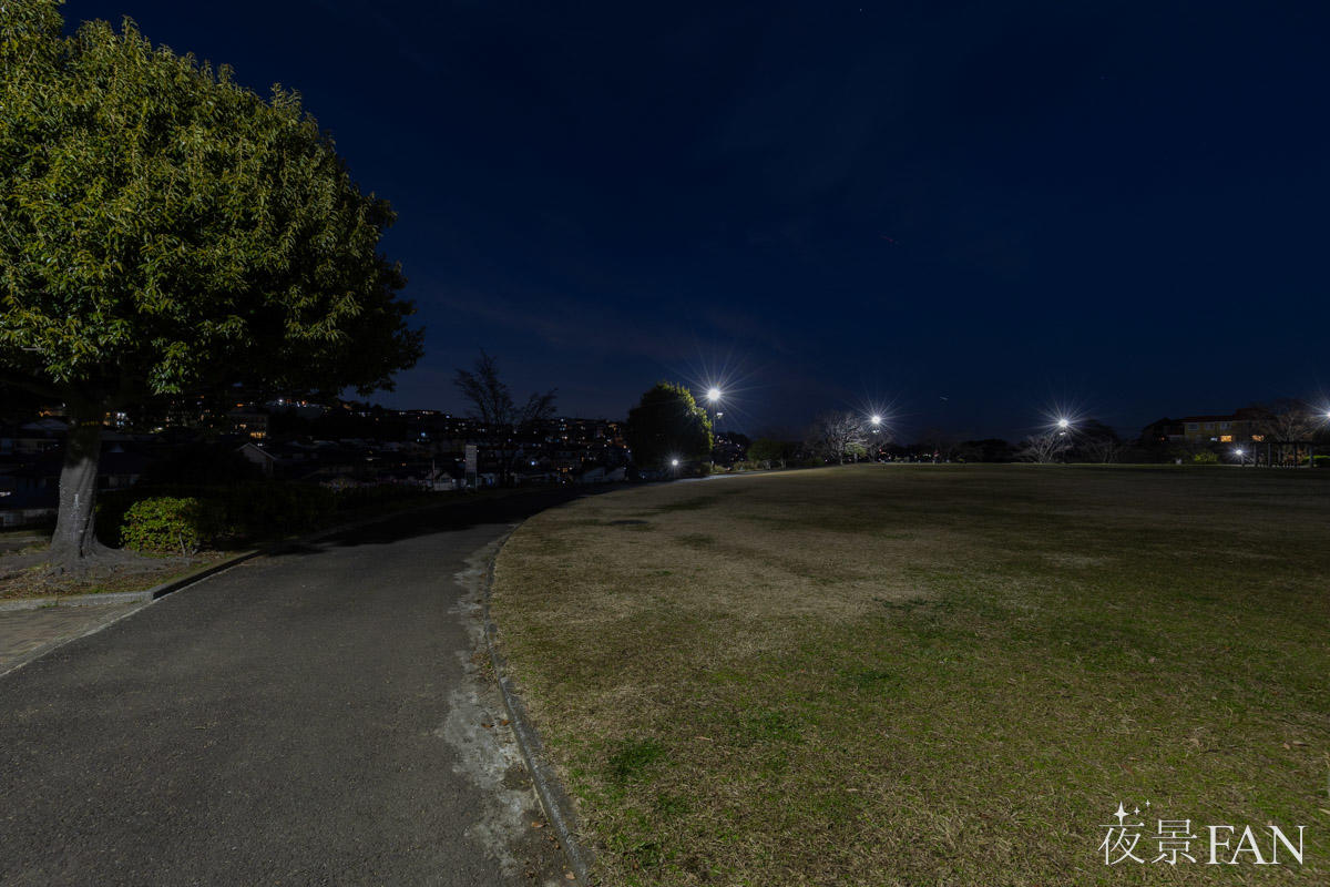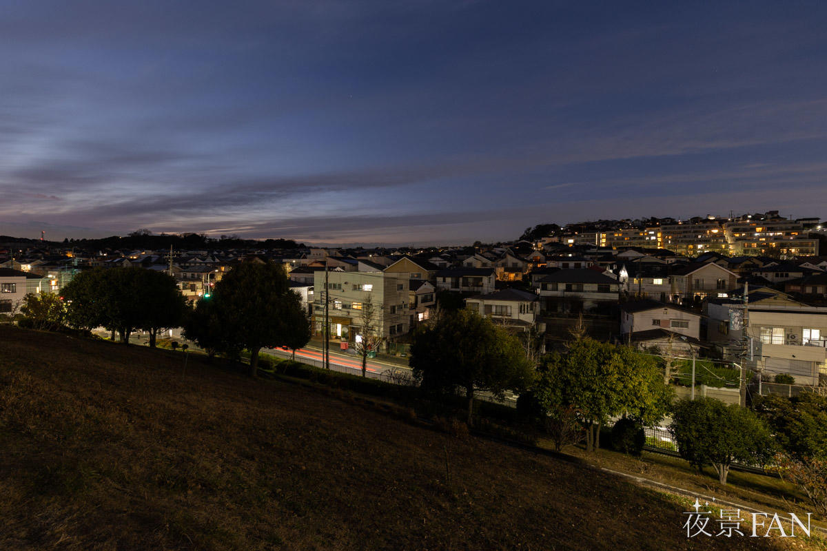 公園は斜面地に整備されており、広場付近からは富岡西の住宅地夜景を一望できます。派手な明かりはありませんが、丘陵に沿って連なる家々の灯りが、横浜郊外らしい穏やかな夜景を描き出します。