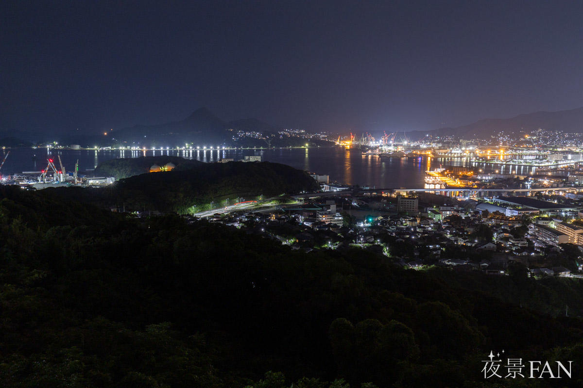 眼下には港湾エリアの灯りと市街地の明かりが連なり、海と街が一体となった佐世保らしい夜の景色を一望できます。