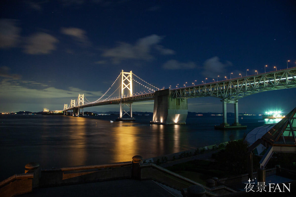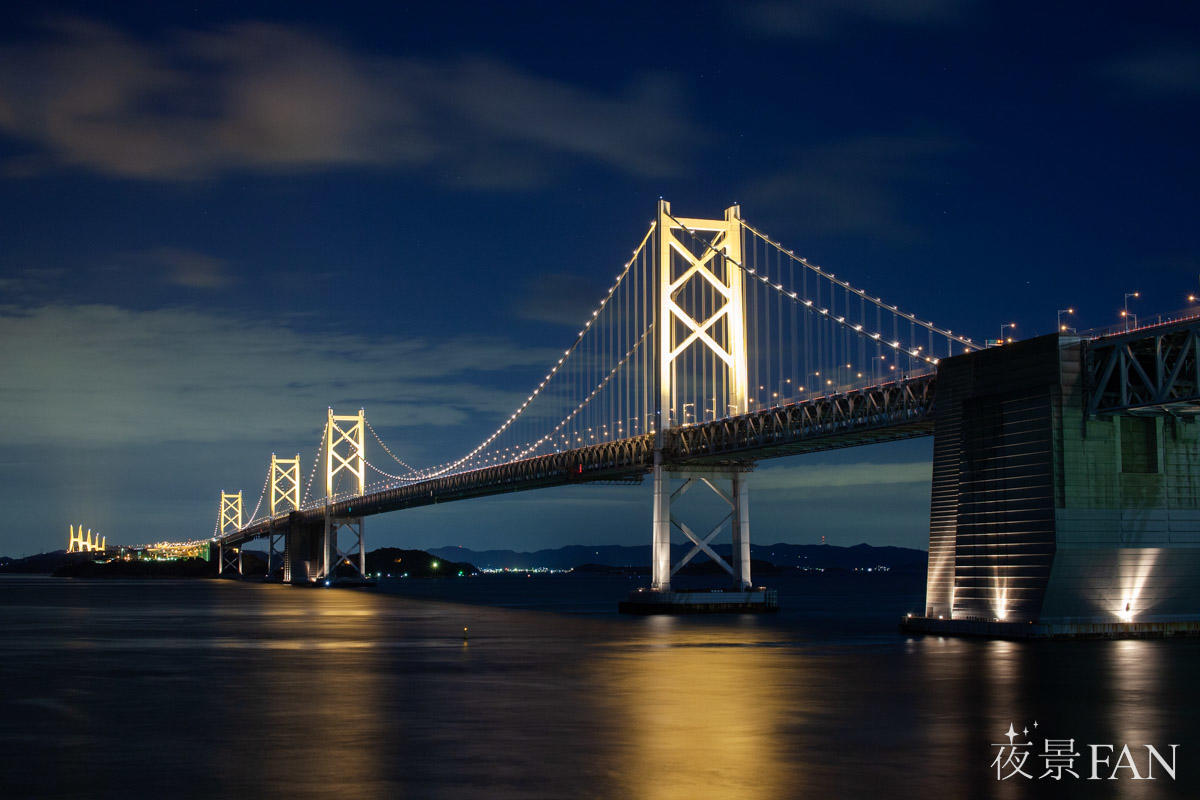夜になると、瀬戸大橋のライトアップが浮かび上がり、連なる橋脚やトラス構造が美しいラインを描きます。視点を変えることで、橋全体を横から捉えた夜景や、下から見上げる迫力ある構図など、さまざまな表情を撮影・鑑賞できるのも魅力です。天候に恵まれた日には、水面に映る光が加わり、瀬戸内らしい穏やかな夜景が完成します。